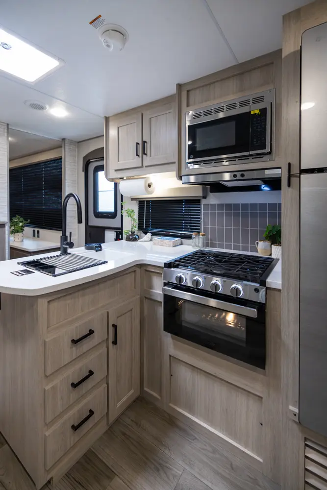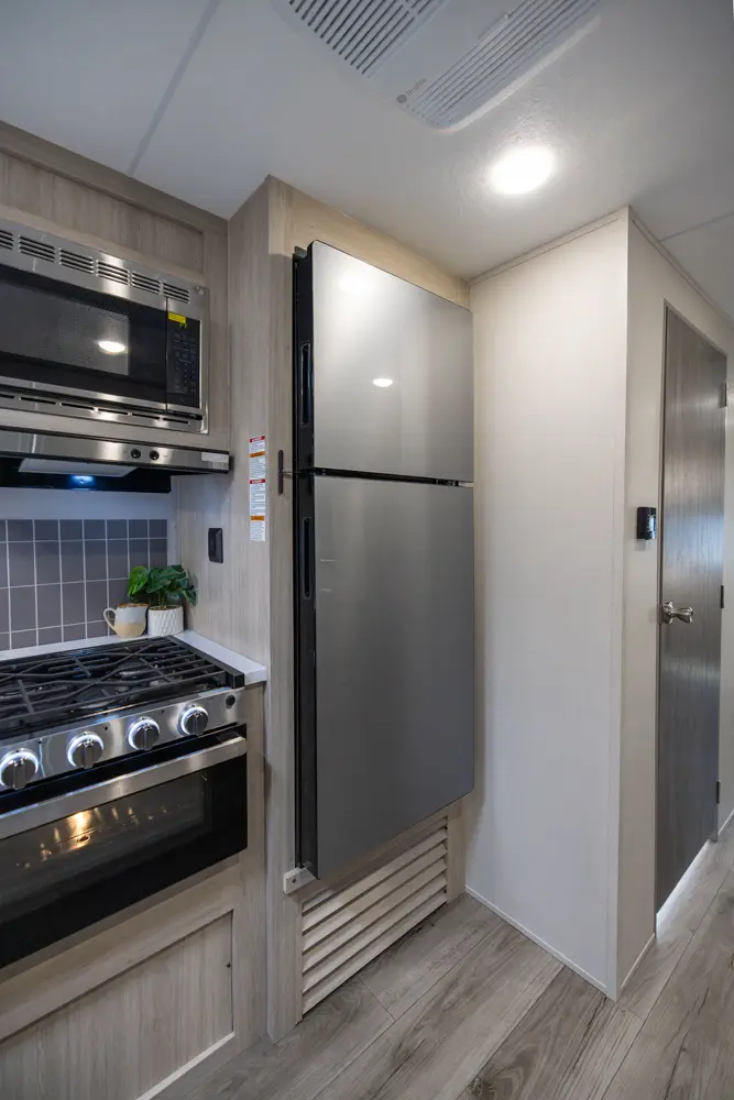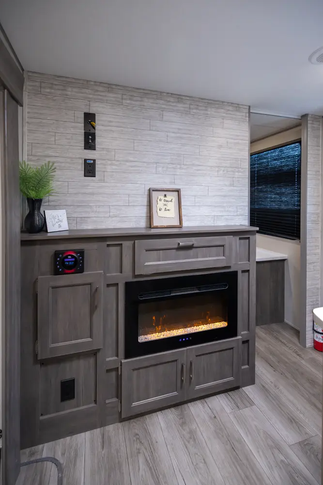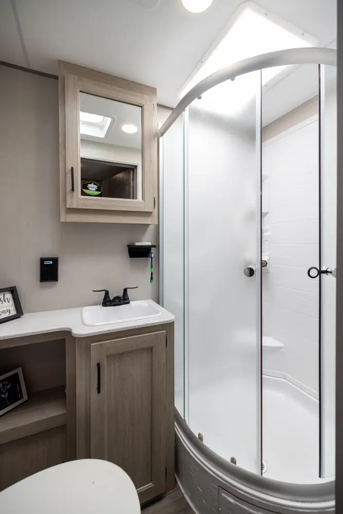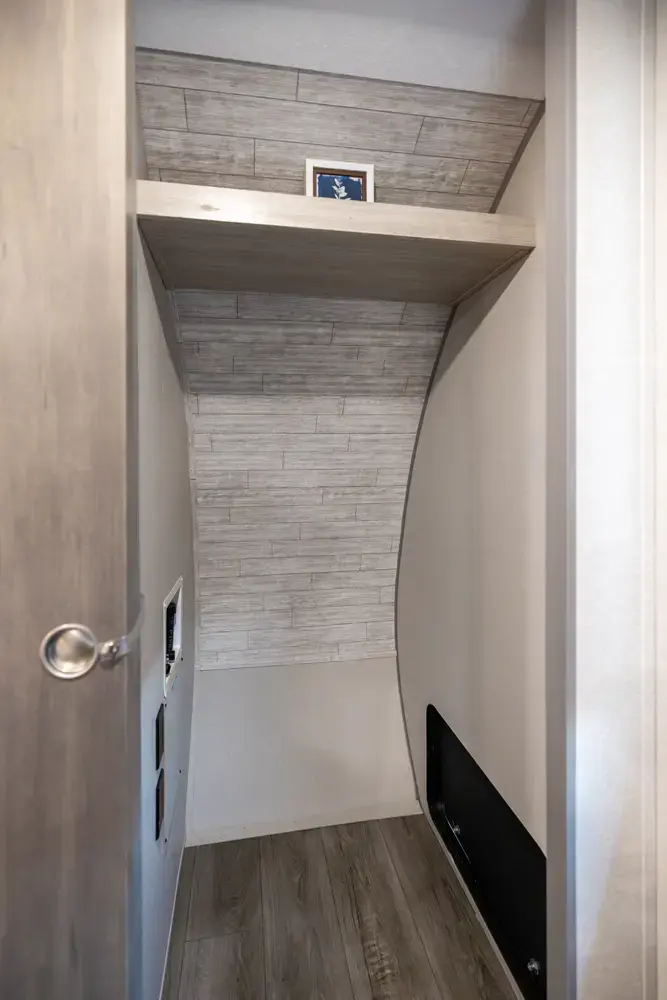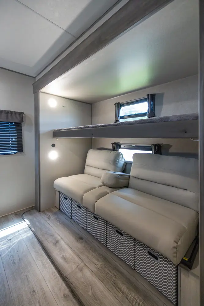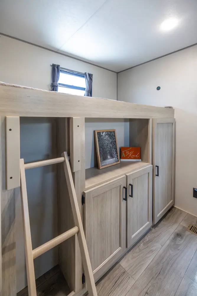 The 343BHTS is the premier bunk house floorplan on the market! Our versatile bunk room sleeps 5+ comfortably and includes an ent. center, storage and our unique COA cube futon. We designed the ultimate master suite with an enormous closet with full length hang rod and shelves, as well as an additional utility closet with everything you need to add washer/dryer. On the outside our standard large camp kitchen includes a griddle, dorm style refrigerator, sink, and storage cabinets and drawers.