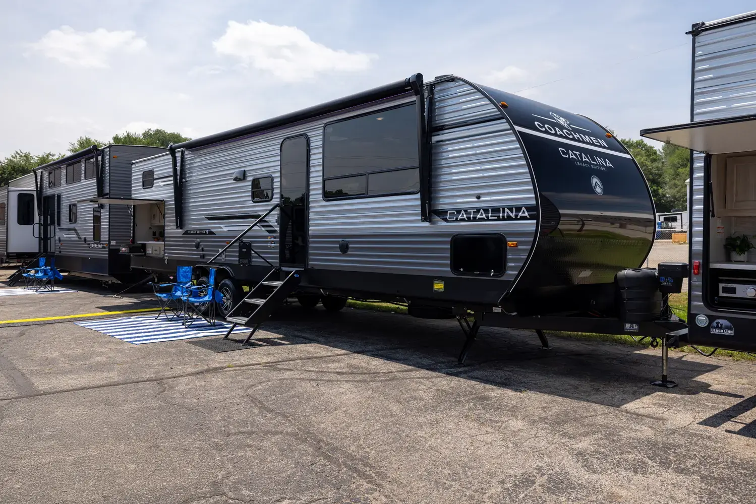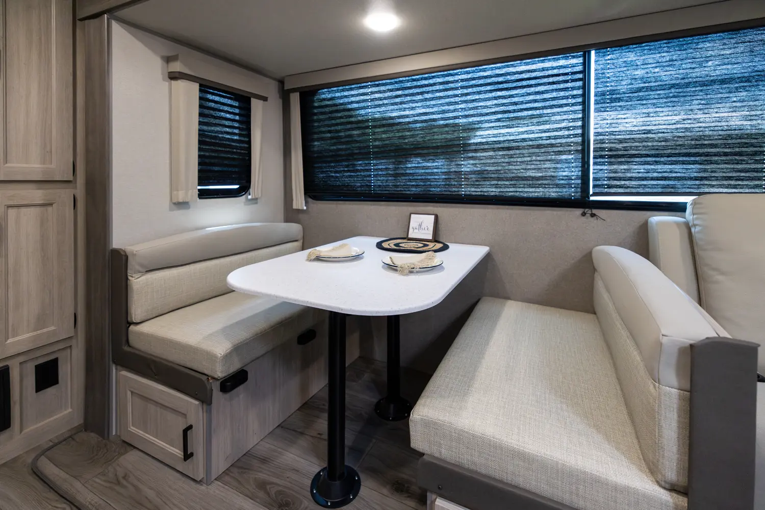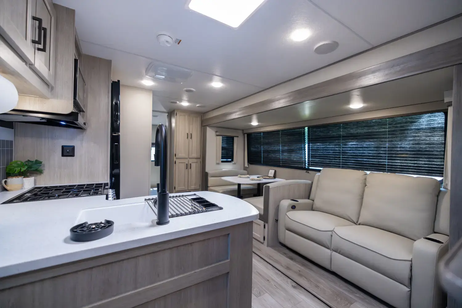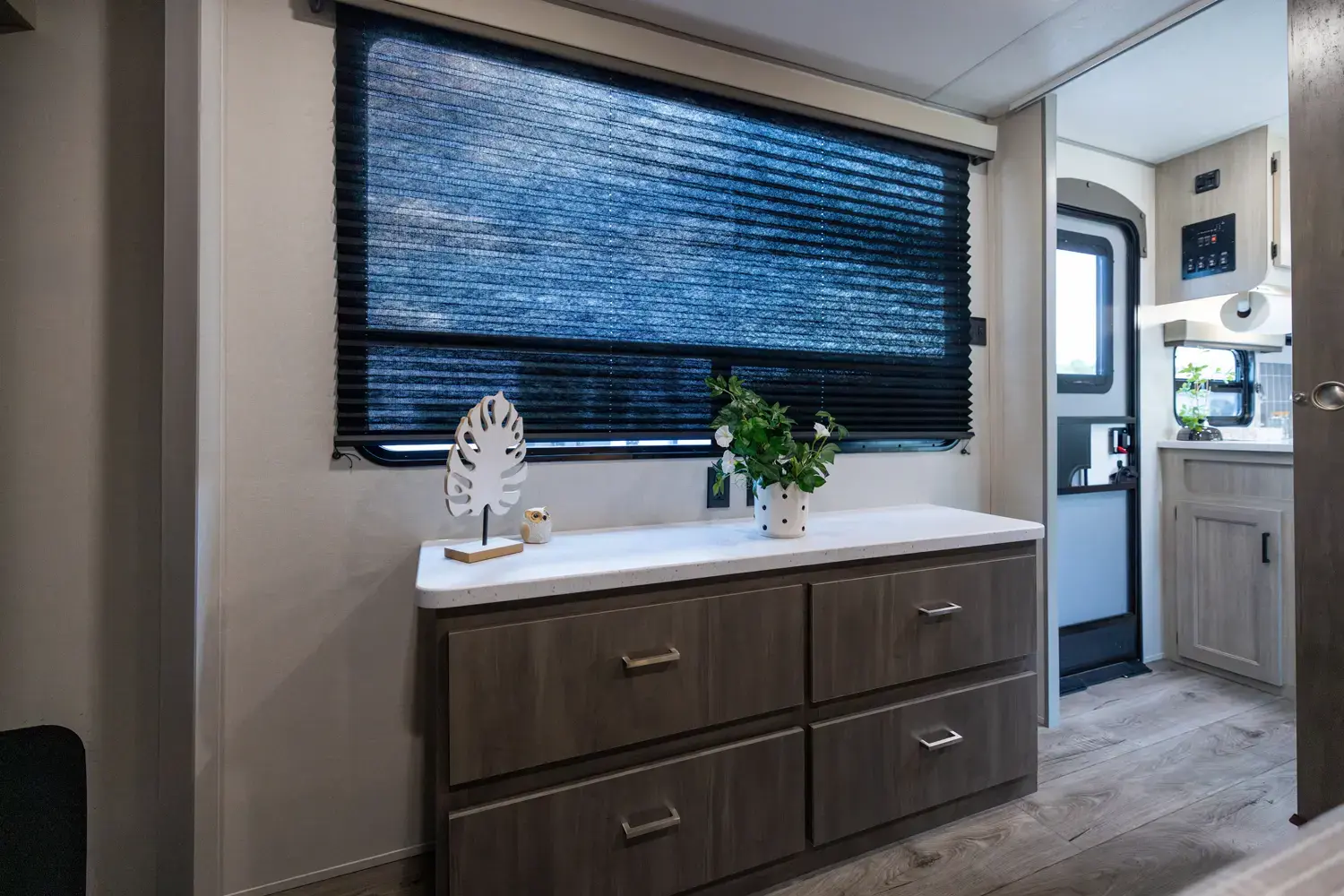 The 343BHTS is the premier bunk house floorplan on the market! Our versatile bunk room sleeps 5+ comfortably and includes an ent. center, storage and our unique COA cube futon. We designed the ultimate master suite with an enormous closet with full length hang rod and shelves, as well as an additional utility closet with everything you need to add washer/dryer. On the outside our standard large camp kitchen includes a griddle, dorm style refrigerator, sink, and storage cabinets and drawers.