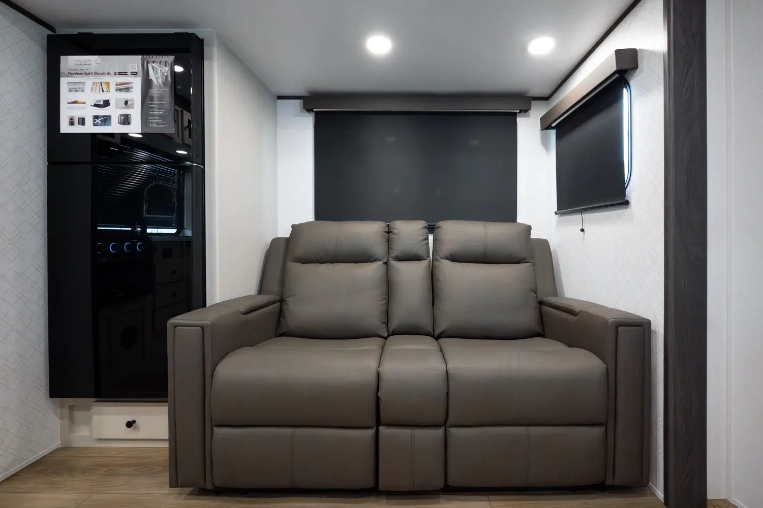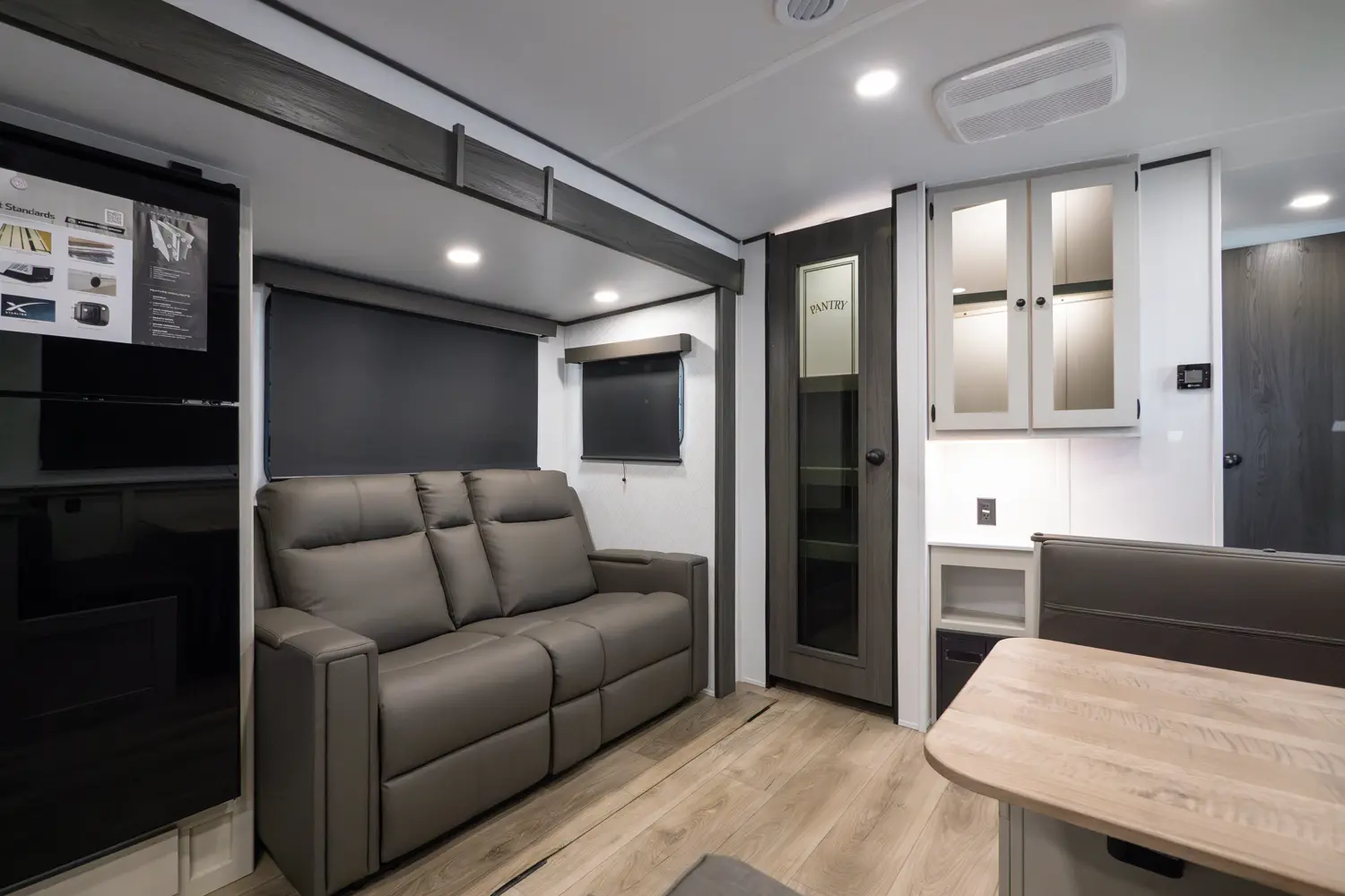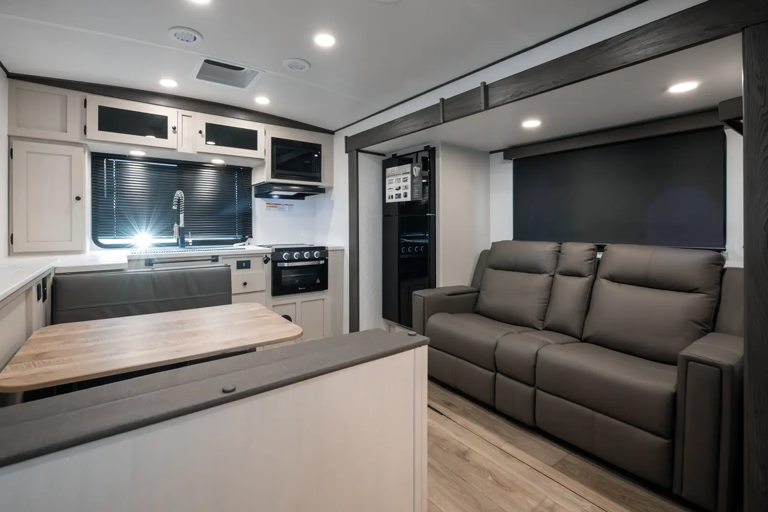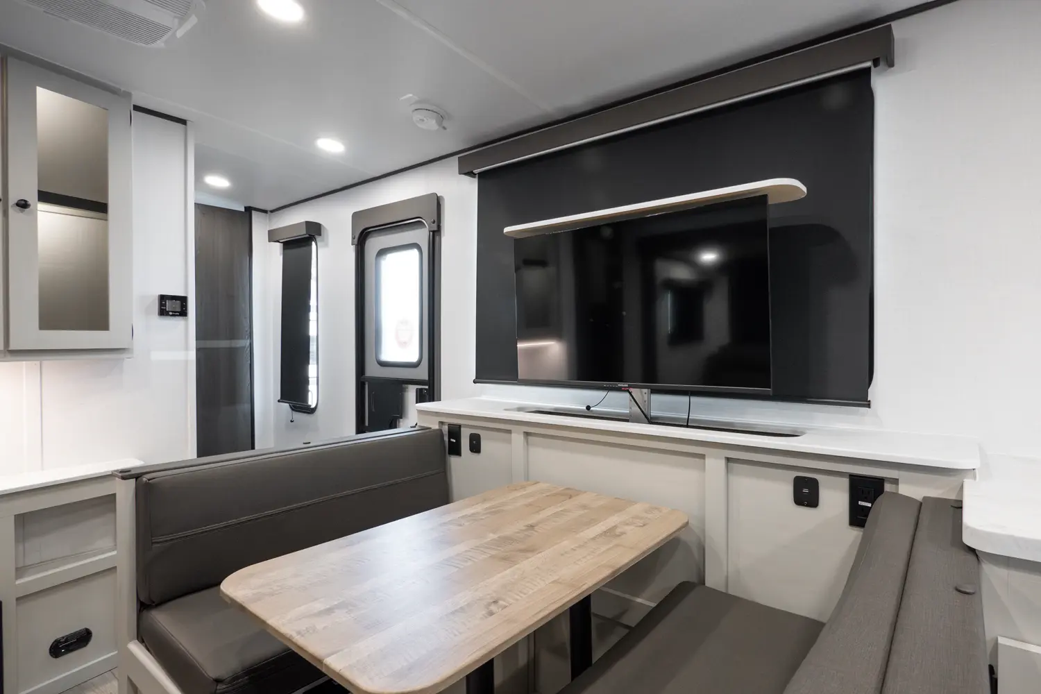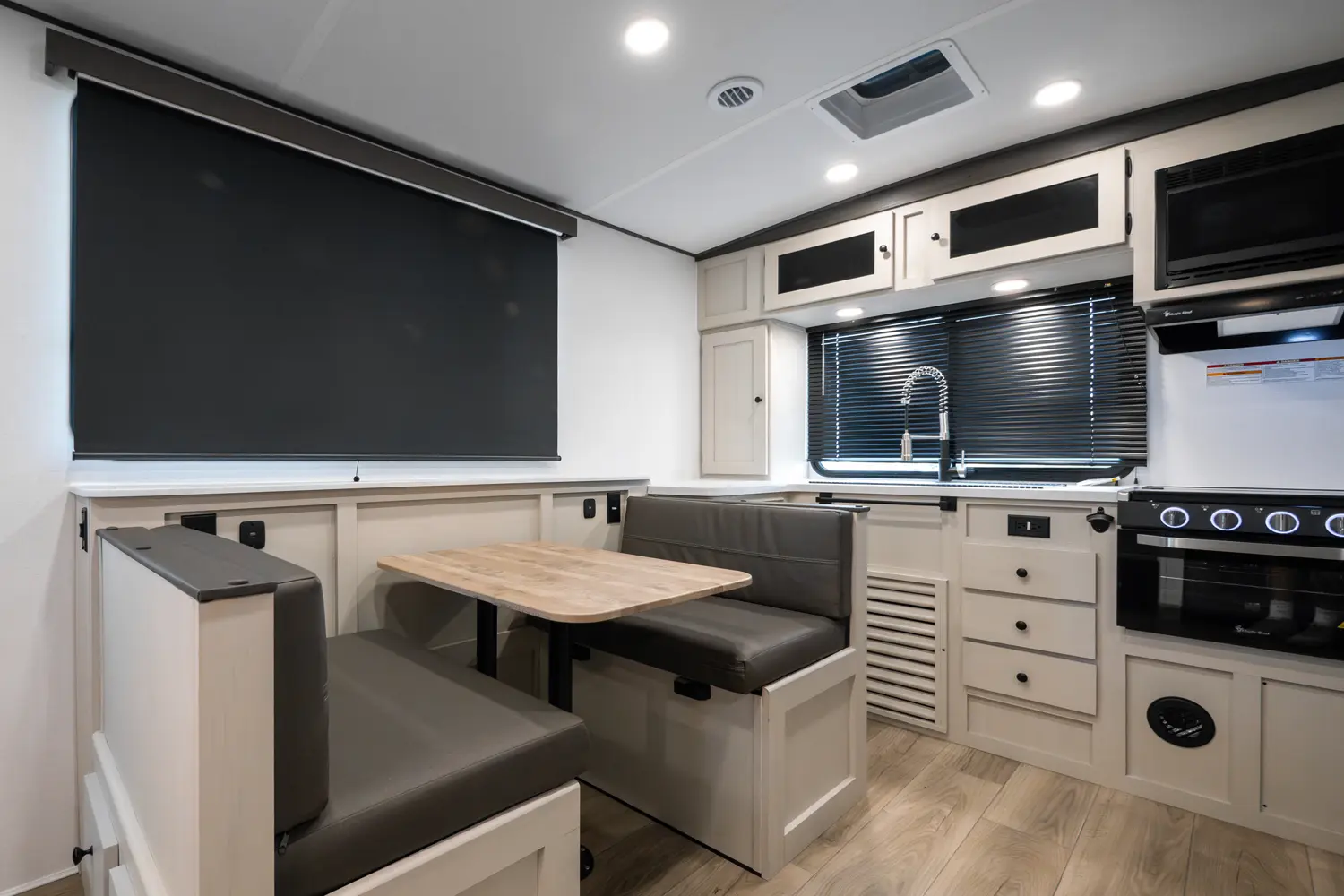 This couples coach comes in under 30 feet and right at 6000 lb. The living space includes a 50” TV on a televator directly across from your seating area. Tons of counter space, a floor to ceiling pantry, booth dinette, and an abundance of windows on the camp side make this a very popular couples coach.
