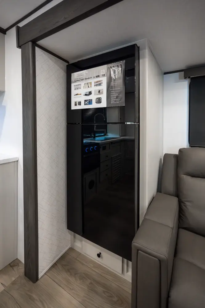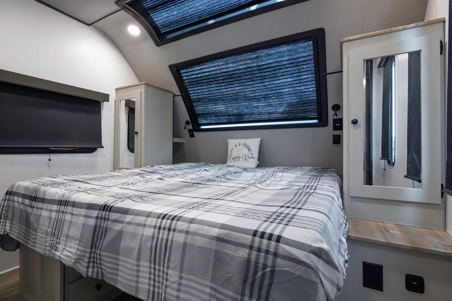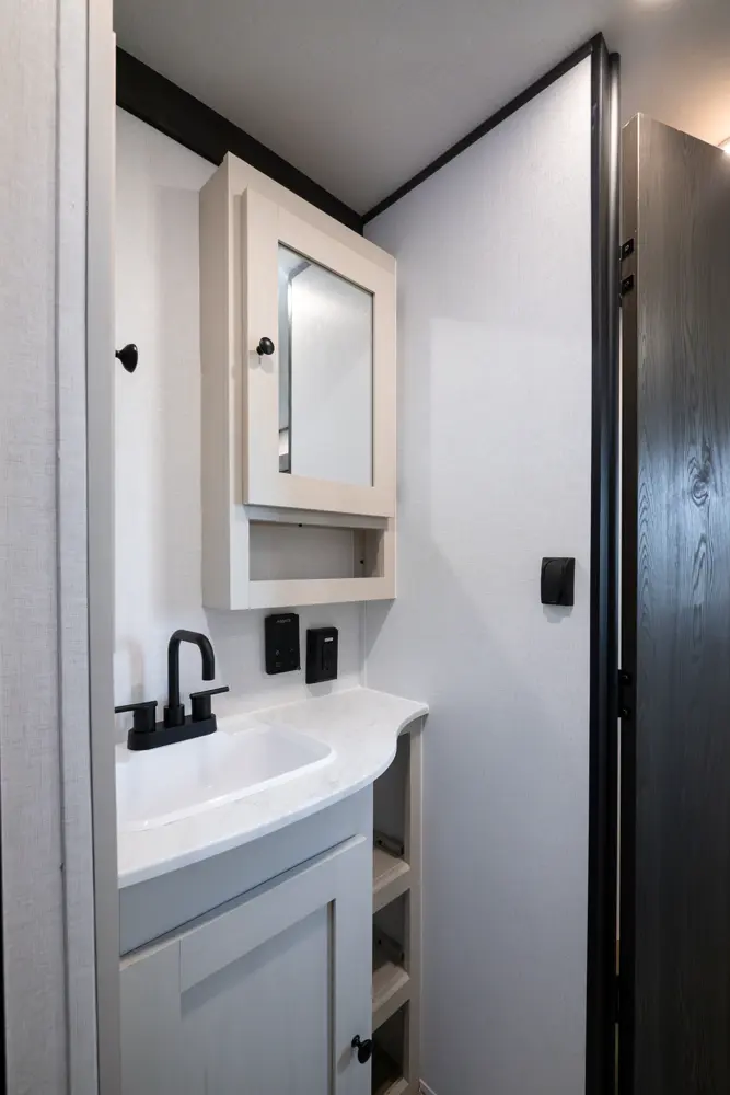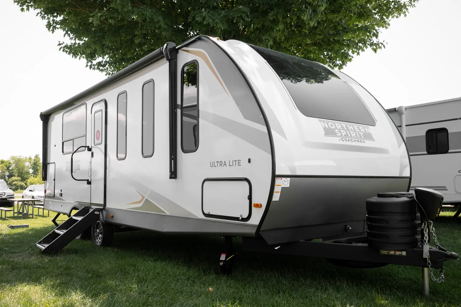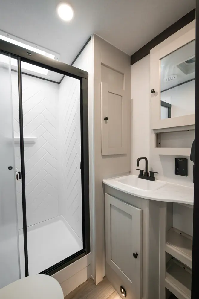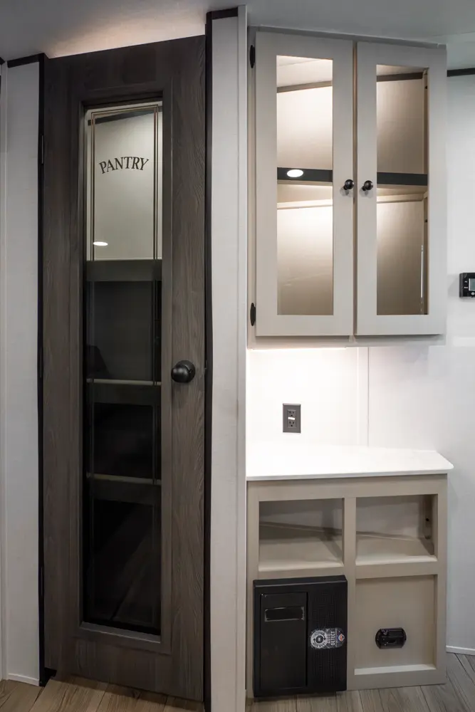This couples coach comes in under 30 feet and right at 6000 lb. The living space includes a 50” TV on a televator directly across from your seating area. Tons of counter space, a floor to ceiling pantry, booth dinette, and an abundance of windows on the camp side make this a very popular couples coach.